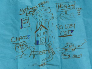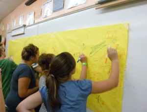 I experienced one of these positive moments during a “back to school” team-building session with students at Twin Valley Middle School (TVMS) in Whitingham, VT. I was scheduled to “kick-off” the school year with community building activities the first week of school. When Irene wreaked havoc on our community, school started a week late. When I arrived to work with students after the delayed start it seemed important to reflect on the flood, and the unusual start to the year along with the excitement, anticipation and stress that comes as a normal part of the beginning of middle school. I engaged students in a reflective activity called “Graffiti Wall” that I learned from Kasey Errico an educator who attended my workshop at the Association for Experiential Education conference last spring.