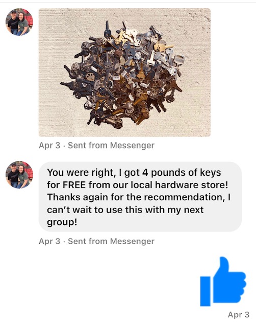 The possibilities for using keys in a metaphorical way are endless. Use your creativity! At the very least having them on hand in your toolkit as a playful interactive way for group members to find partners for pair sharing conversations (see blog post). Contact me for copies of the “Key Reflection” worksheets I’ve used that you can adapt to your programs.
