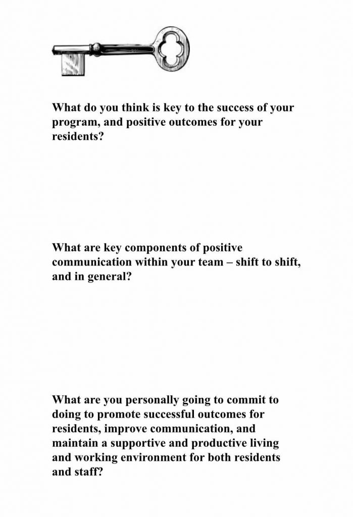 ›What actions are you going to take to promote successful outcomes for residents (treatment program), improve communication, and maintain a supportive and productive living and working environment?
