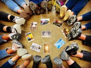It also models from the beginning that there will be many answers, possibilities, and options in the upcoming group experience and that the group are partners in facilitating, teaching, and learning. Check out these articles for more examples of online and in person “smaller circles” and “partner dialogue” strategies, including some no-prop options: Setting the Tone: Creating a Positive Environment for Learning, Object and No Prop Pair Share Activities to Set the Tone, Build Community, and Initiate Reflective Discussions, and “Keys” to Community, Group Success, and More: A Multi-Purpose, Upcycled Tool for Reflection.